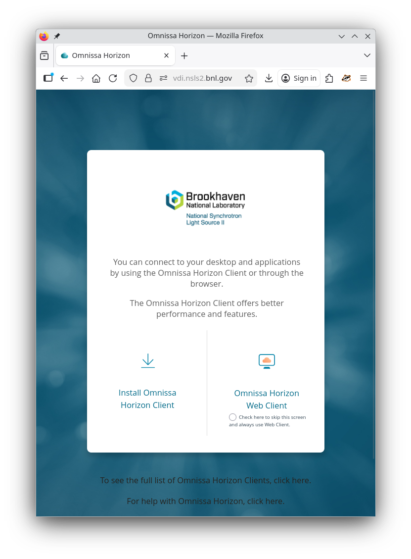 Fig. 4.9 The landing page at https://vdi.nsls2.bnl.gov/ prompts you to download the Omnissa client or continue with the browser app.#