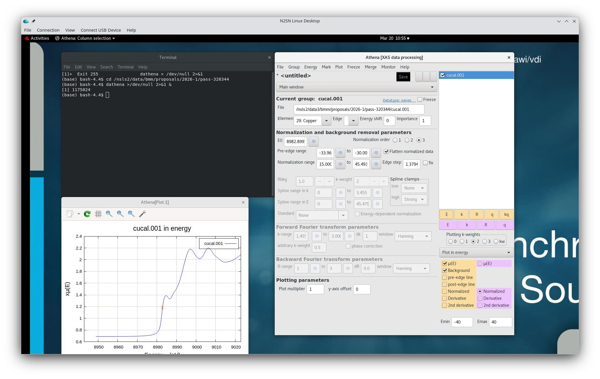 Fig. 4.13 The Linux desktop with an open terminal window, Athena, and plot of data.#