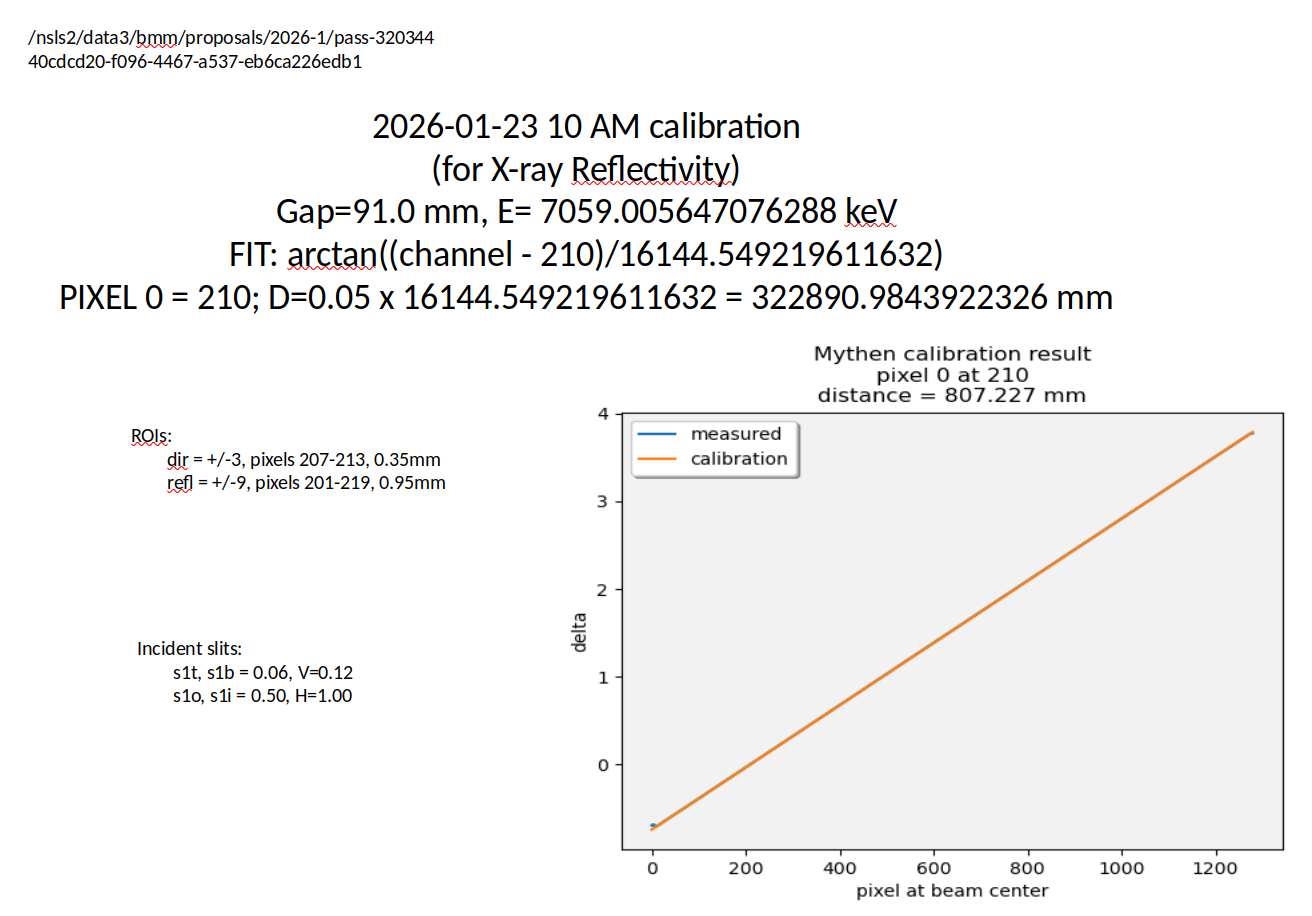 In the upper right corner of this report, the path to the proposal folder is written as is the UID of the Tiled record. The numerical results of the fit are given in the main text. A plot of fit to the beam position on the detector is shown in the plot. Form this fit, we get the formula for mapping delta angle to direct beam detector position, as well as values for the gap, the distance form the goniometer eucentric to the detector, and the pixel underneath the direct beam at delta=0.