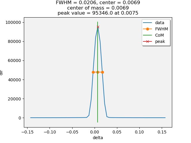 Fig. 4.9 Showing the interpretation of the direct beam ROI as a function of delta angle. This should be narrow and centered very close to 0. Note that the com and cen are at the same position. This is a good alignment!#