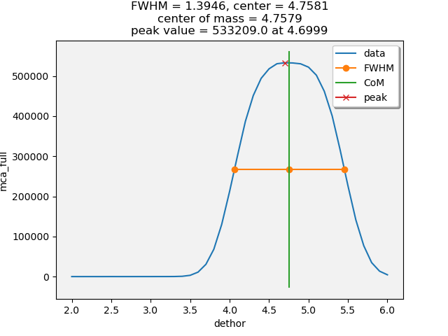 At the end of the scan, the direct beam peak is interpreted for peak, com, and cen positions. The offset of the delta motor is reset so that the cen is at 0. This should be a very small change in offset.