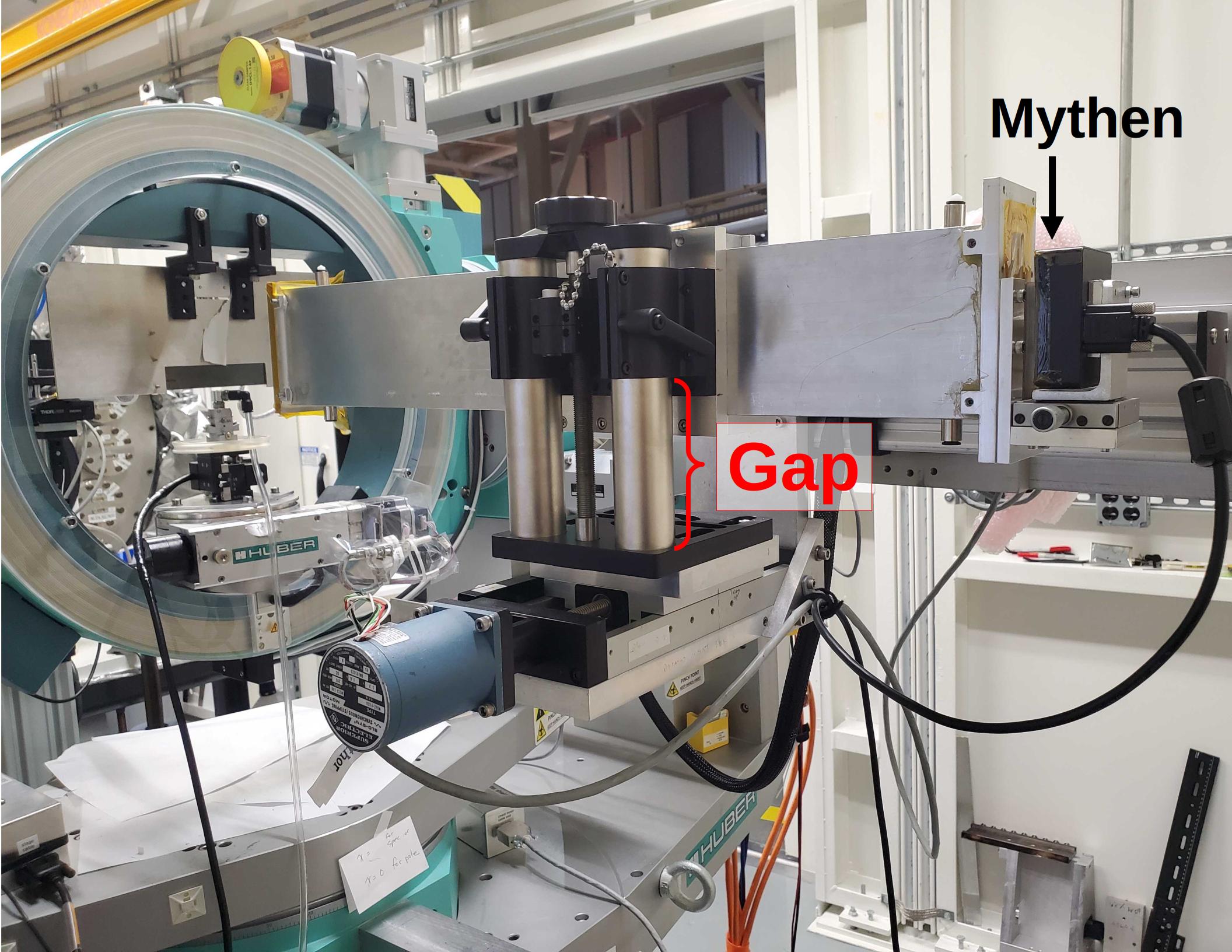 To start, place the Mythen in the most downstream position on the (what is the arm called?) Measure and record the gap value – typically around 90 mm. See Figure 4.5 for a photo identifying what the gap is.