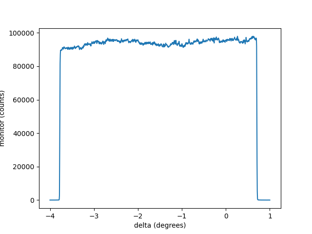This scan will find the extent of the detector in delta. As the beam passes over the detector, the signal will be approximately constant.