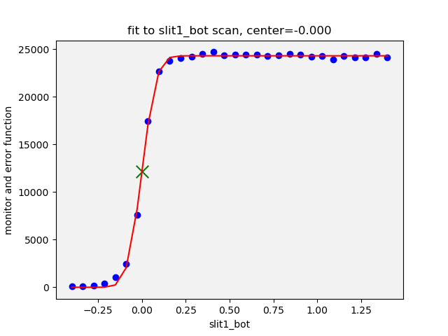 The slit alignment procedure will run a linescan (need link to linescan explanation) on each of the four slits individually, plotting the signal on the monitor (need link to monitor explanation) versus slit position. This signal should be a step-like function, so the result is fit to an error function. The slit is moved to the centroid of the fitted error function and the offset of the slit is reset to define the zero position. The result of an individual slit scan looks like Figure 4.3.