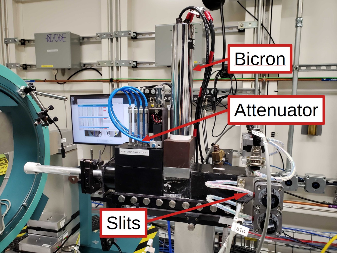 Fig. 3.2 The incident beam assembly for the goniometer, showing the slits, the attenuator box, and the Bicron monitor.#