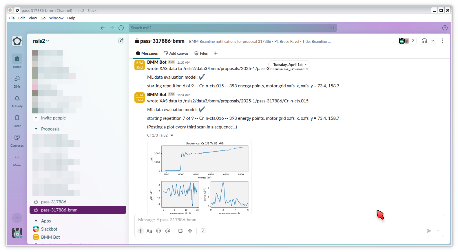 Throughout the course of the experiment, messages and figures will be automatically posted to that channel. This allows someone to keep track of progress and to keep an eye on data quality without being physically at the beamline.